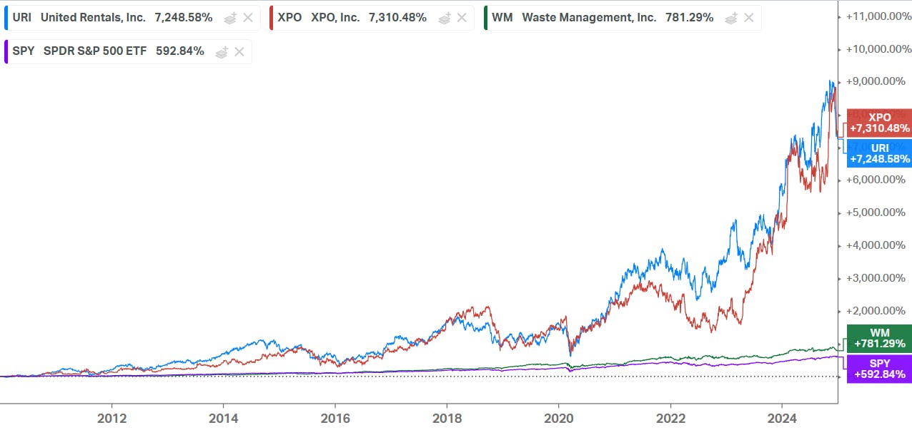In 1997, Jacobs founded United Rentals, which pursued a similar consolidation strategy in the highly fragmented equipment rental industry. The company focused on heavy equipment such as excavators, scissor lifts, and telehandlers, serving construction and industrial customers across North America. United Rentals went public three months after its founding, and grew through a rollup of regional rental dealers across North America. United Rentals would go on to become the world’s largest equipment rental provider, and one of the best-performing US stocks of the 2010s, returning over 1,400% from December 2009 to December 2019.