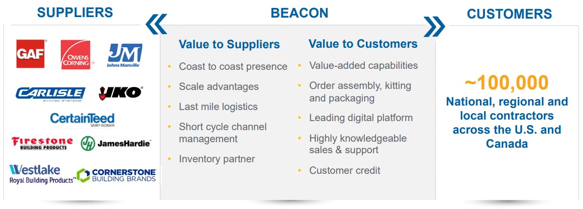 That same year, private equity firm Code, Hennessy & Simmons acquired a majority stake in the company. This marked the beginning of an aggressive consolidation strategy. Beacon began acquiring regional distributors across North America, starting with Quality Roofing Supply in Pennsylvania, and continued to roll up operators in the US and Canada. Some of the companies Beacon bought included Best Distributing in North Carolina, The Roof Center in Maryland and Virginia, and Groupe Bedard in Quebec.