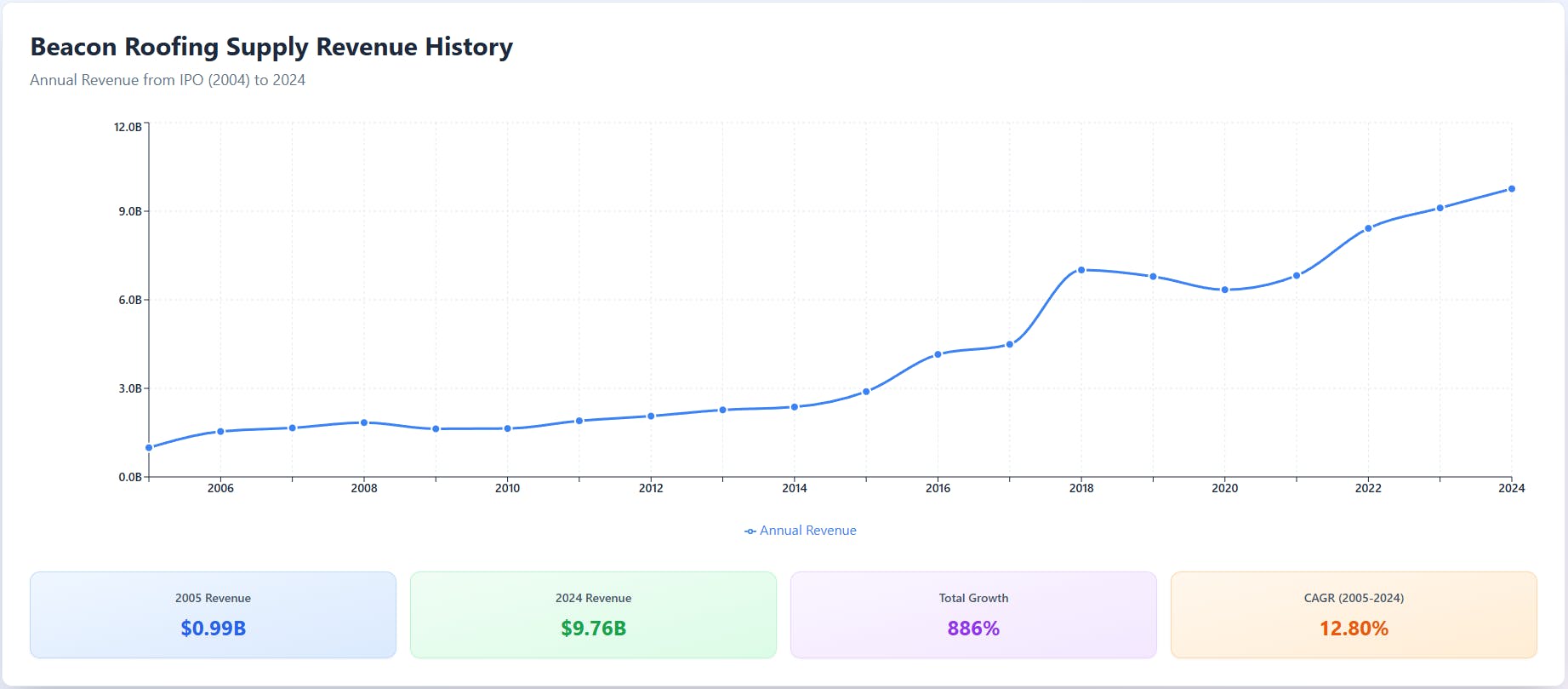 By 2004, Beacon had surpassed $500 million in revenue and completed its initial public offering. The public capital base enabled further M&A. Over the next decade, Beacon continued to grow both organically and through acquisitions, entering new markets in the Midwest, Southeast, and Western Canada, and surpassing $2 billion in annual revenue by 2012.